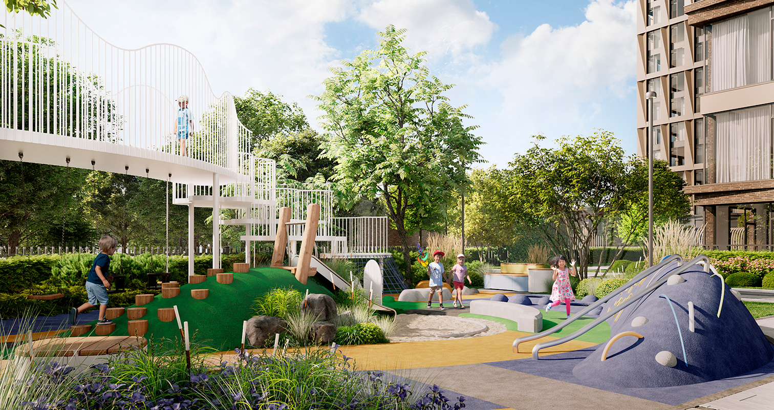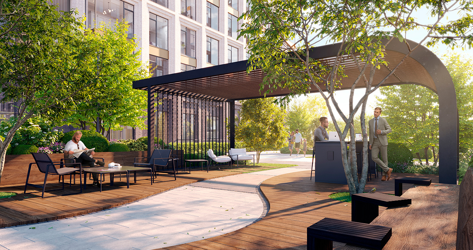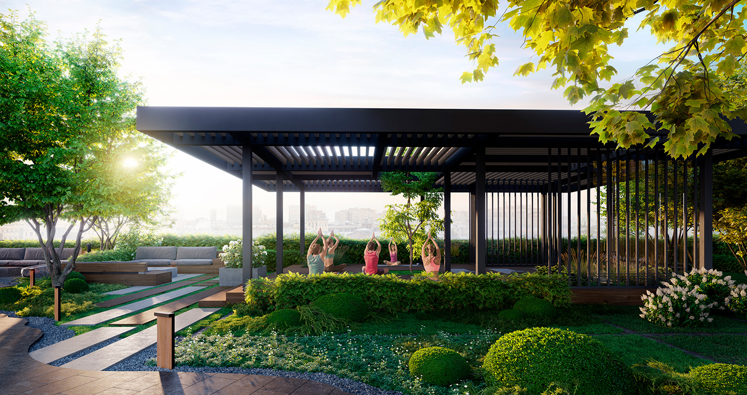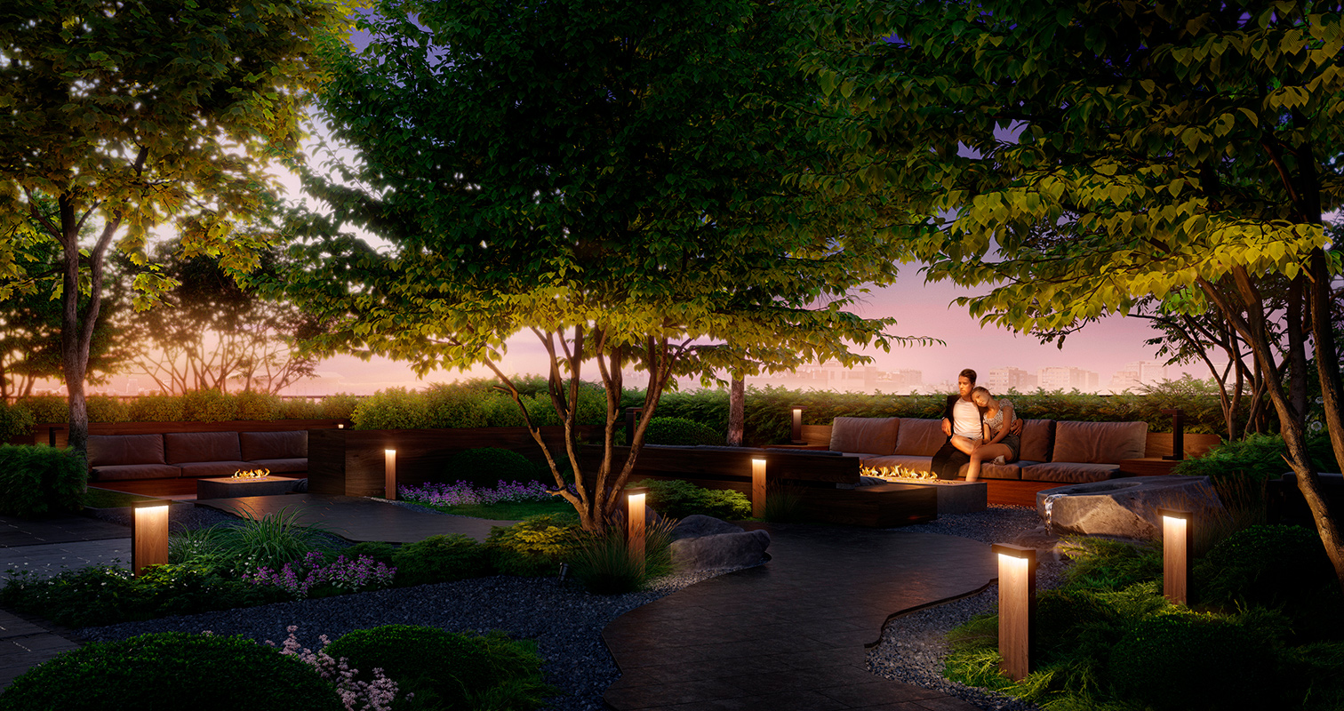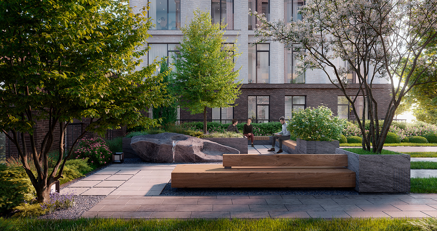 Концепция благоустройства объединяет эстетику и удобство: японский сад, зоны с биокаминомами, приватные зоны и вертикальные зеленые акценты. Автор проекта – Бюро А4.